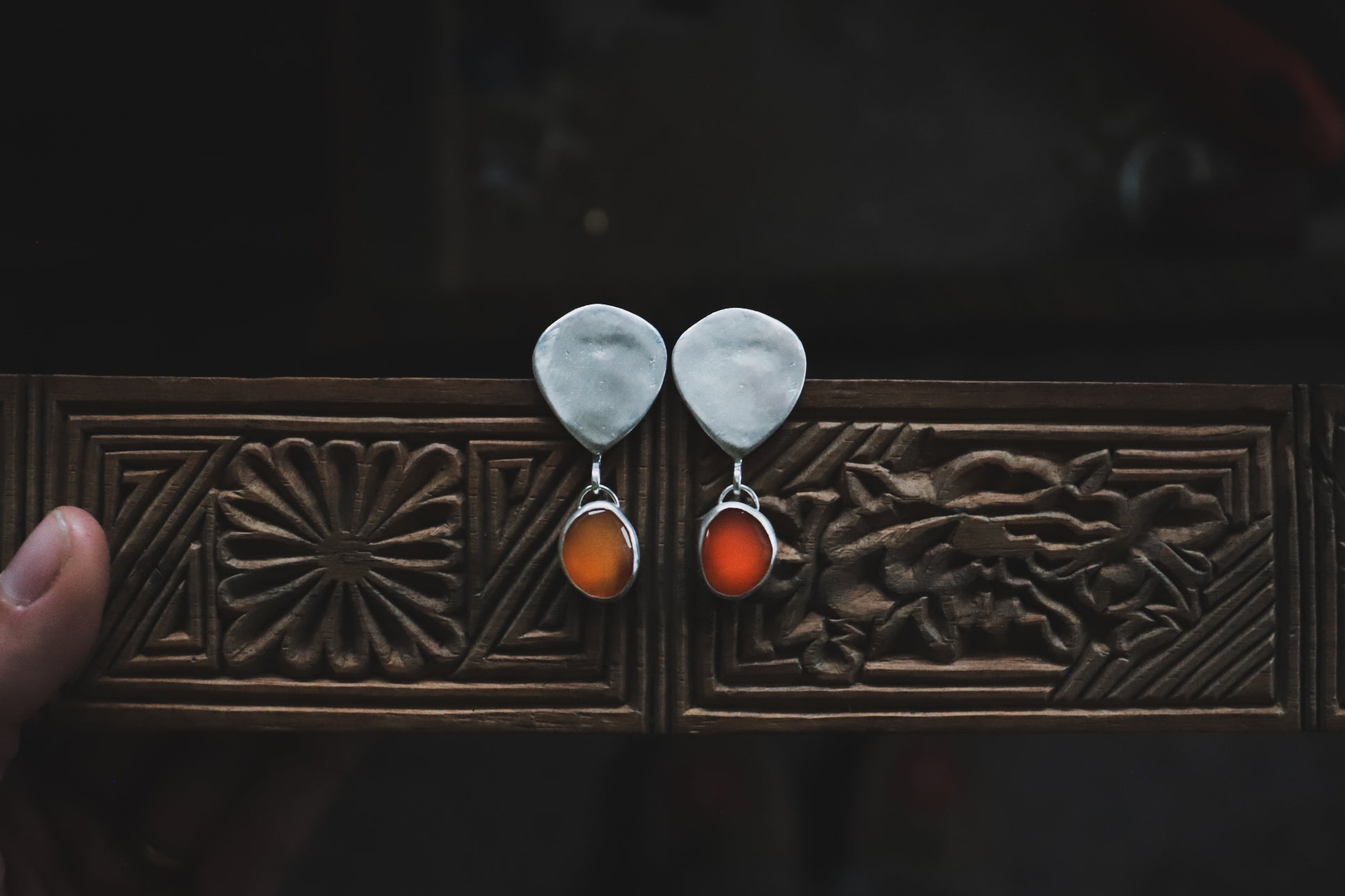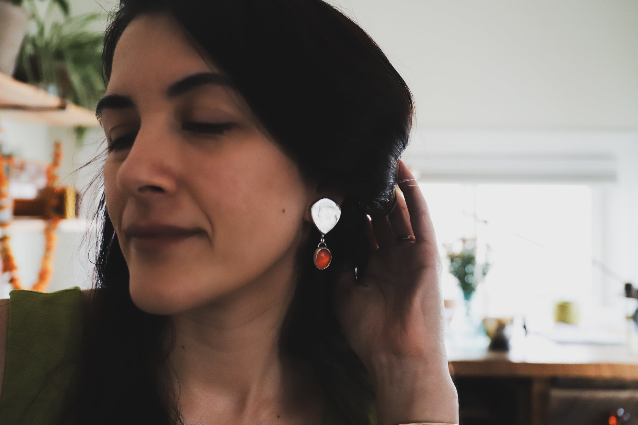 The perfect statement stud to guide you through into the new year! The Shield Post. A new design using handcrafted sterling elements and a beautiful cut of carnelian. These studs are supported on your ear lobe by a sterling stud post and a comfort fit ear backing that helps hug most of the weight as you move about your day. A light patina has been added to accent the hand forged details. Crafted in the mountains of Montana with love.