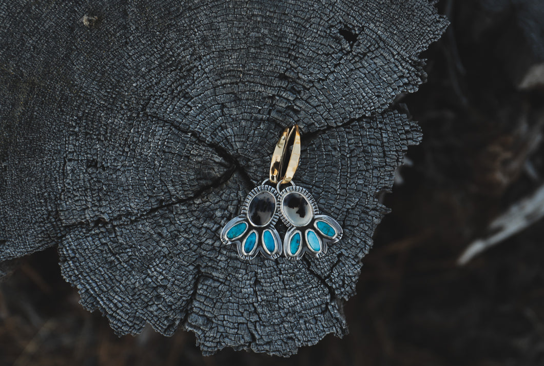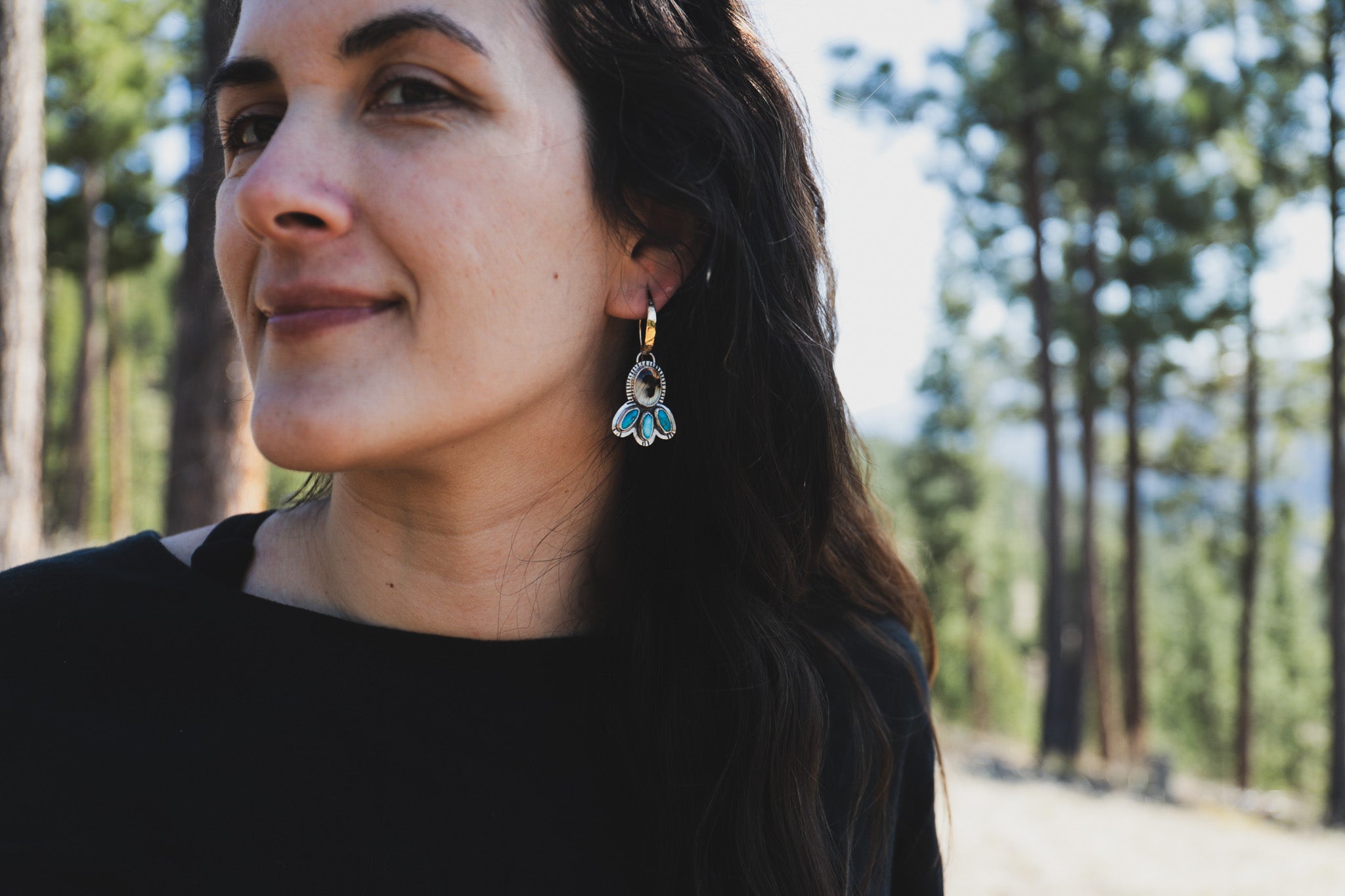 Unique cuts of Montana agate and turquoise set simply by hand in sterling silver with hammered 14K gold earring hooks. A light patina has been added to make the hand stamped details pop! Built to last all your adventures and for many years to come. Made in the mountains of Montana with love.