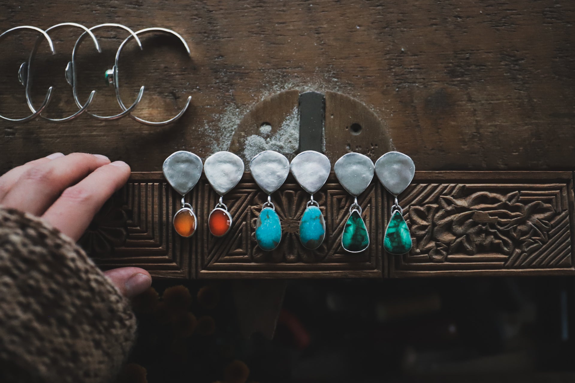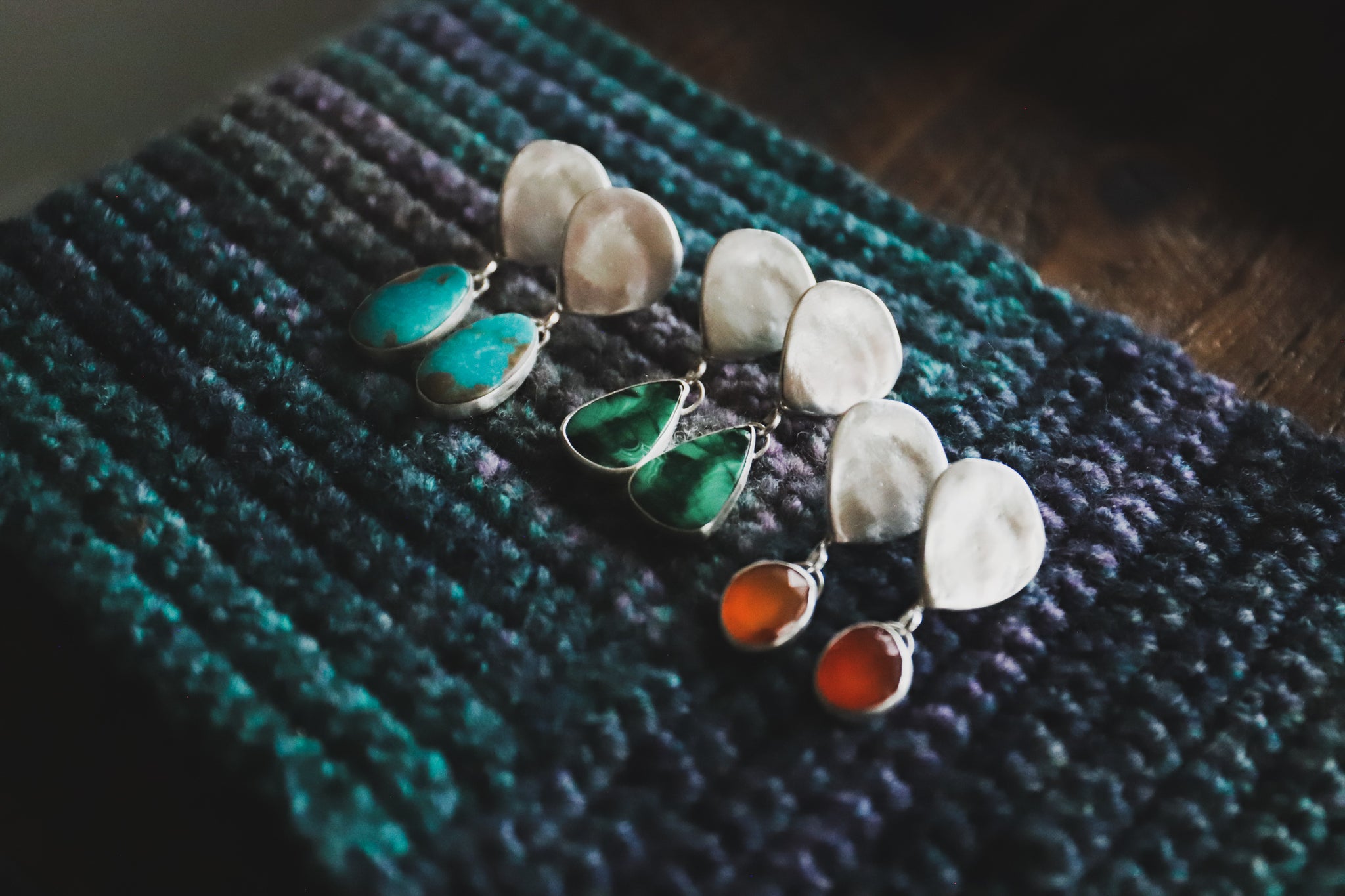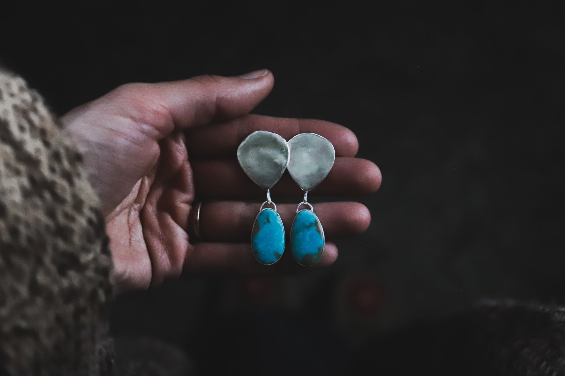 The perfect statement stud to guide you through into the new year! The Shield Post. A new design using handcrafted sterling elements and a beautiful cut of Kingman turquoise. These studs are supported on your ear lobe by a sterling stud post and a comfort fit ear backing that helps hug most of the weight as you move about your day. A light patina has been added to accent the hand forged details. Crafted in the mountains of Montana with love.
